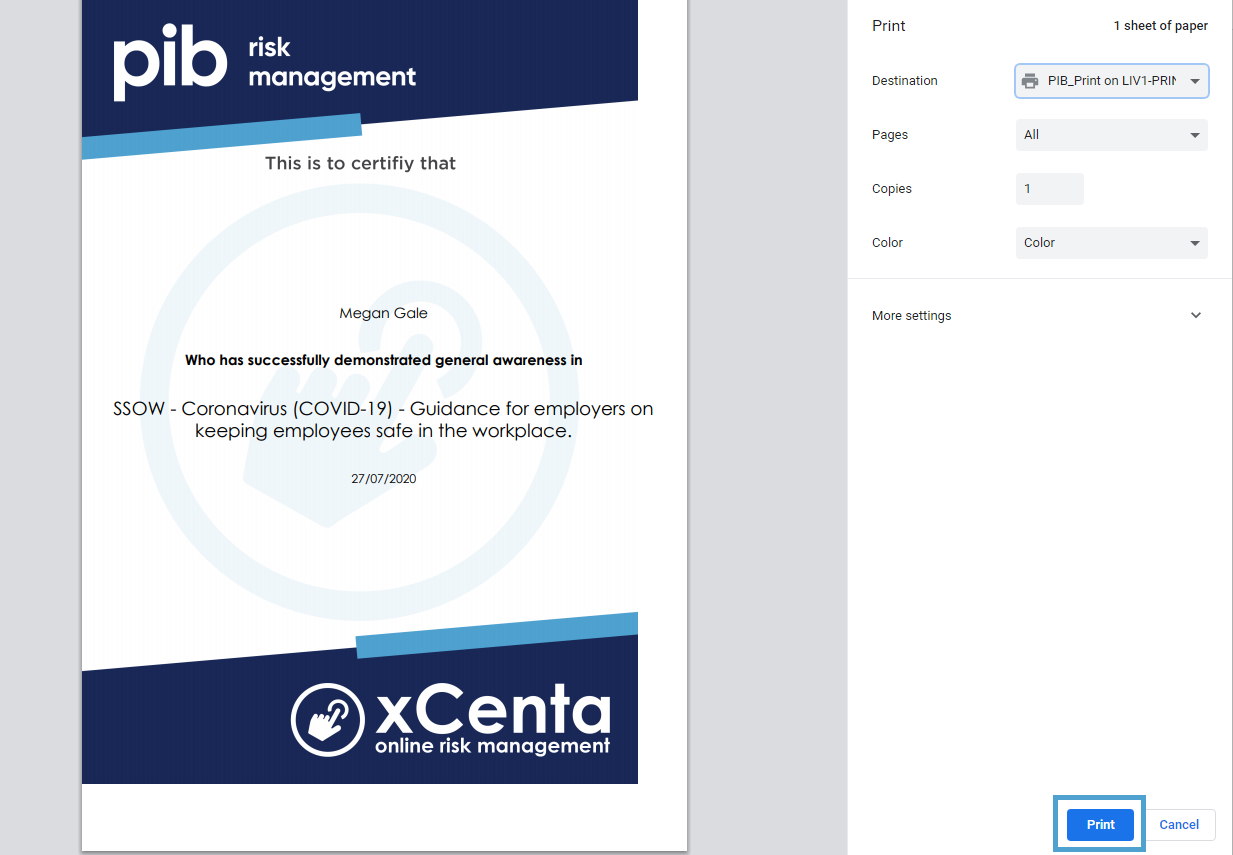 A new page will appear showing the certificate, click on 'Print'.