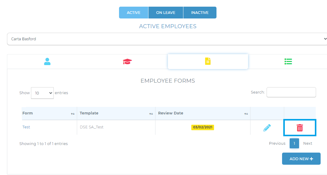The employees forms section will open, Select the Red Dustbin Icon on the Right of the form you wish to delete.