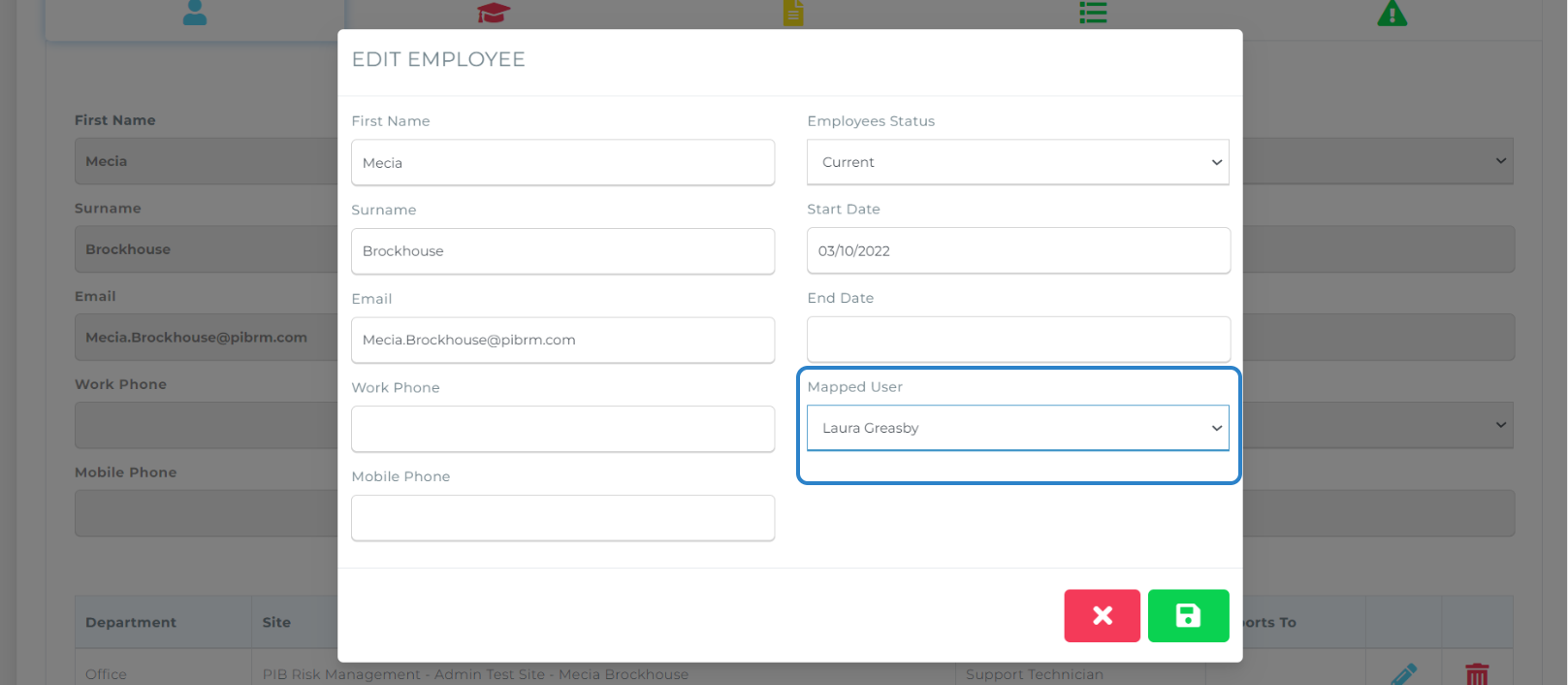 The Mapped User is associated to Laura Greasby rather than Mecia Brockhouse. Click on the drop down box and select Mecia Brockhouse. Then click the Green Save button.