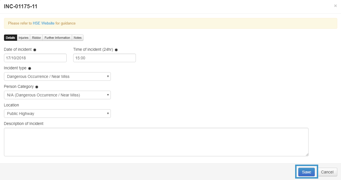 Tab 3 (RIDDOR) is the controls for the incident if it is RIDDOR reportable.