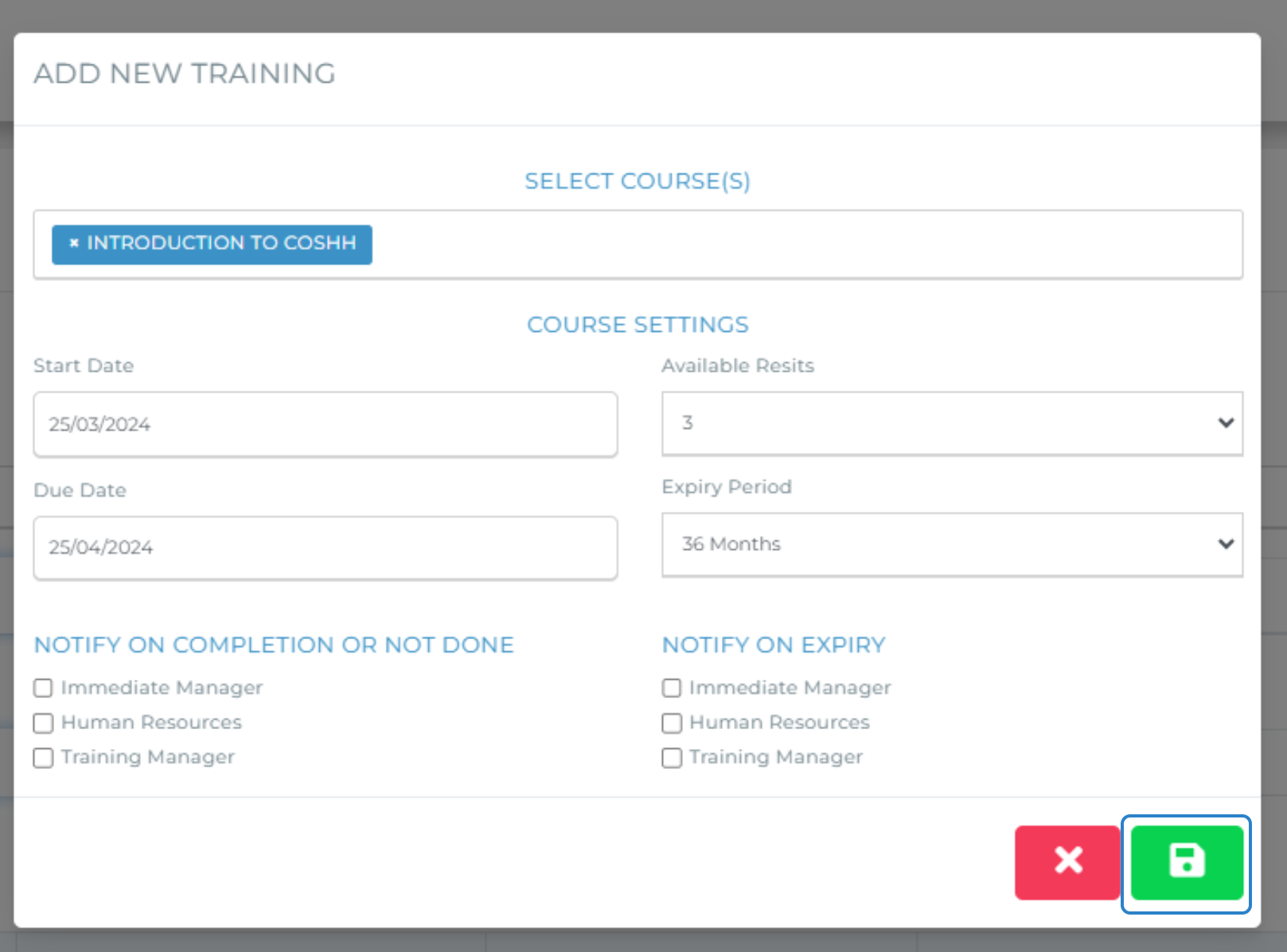 The Expiry Date indicates how long the course is valid for. For example, 36 months will indicate that 3 years after completion of the course, a new course will need to be reassigned.